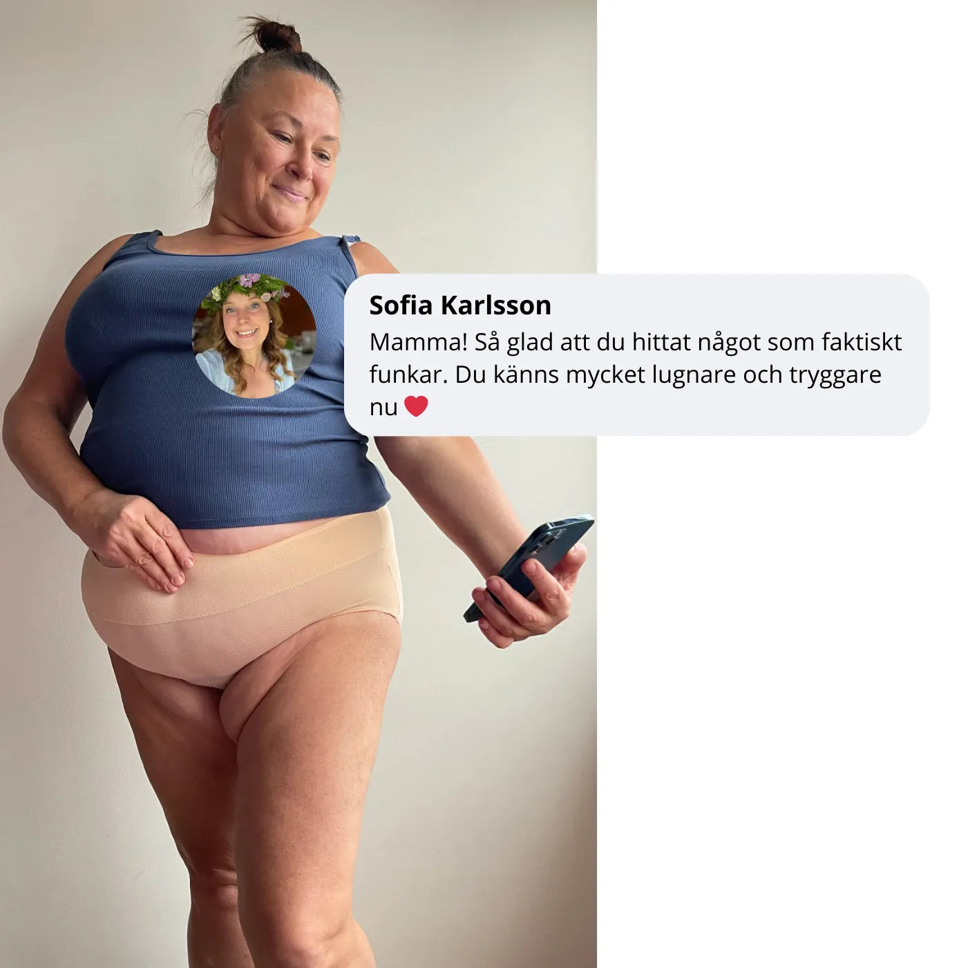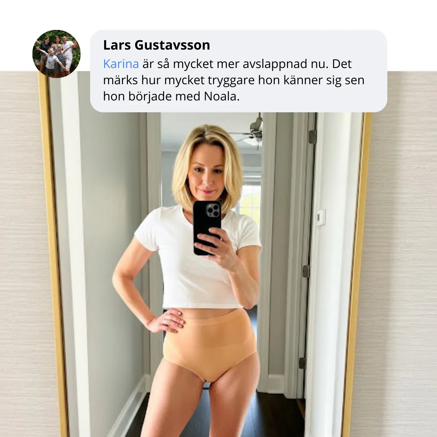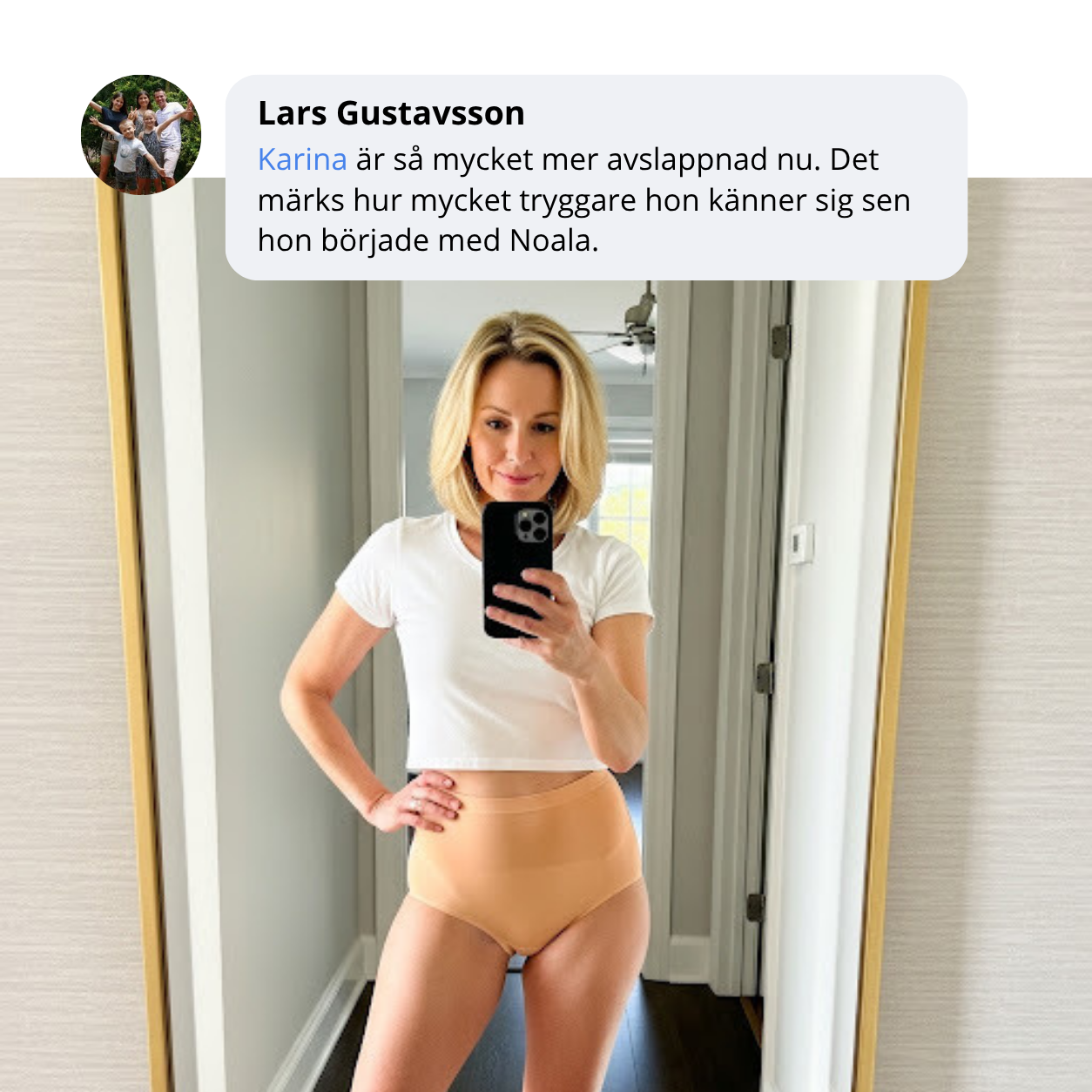 Many women experience urine leakage in everyday life but that does not mean you should have to change your life. Noala panties are developed to give you security and freedom without feeling like a medical pad.